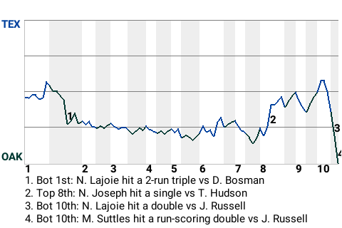The Oakland Athletics beat the Texas Rangers, 4-3, in 10 innings. Oakland second baseman Nap Lajoie, in particular, had a fine performance. He was 4 for 5 with a triple, a double, and 2 singles. He scored 2 times and drove in 2. Oakland reliever Dennis Eckersley picked up the win, upping his record to 1-0. Jeff Russell absorbed the loss. The win moves Oakland to a record of 17-11.