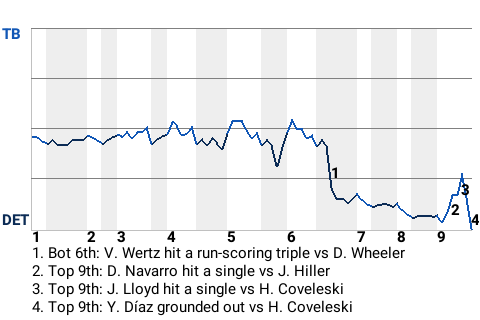 Vic Wertz hit a run-scoring triple off Dan Wheeler in the bottom of the sixth, which put the Tigers in front, 1-0. Wertz had 1 walk, in addition to the triple. For the game, he went 1 for 3.