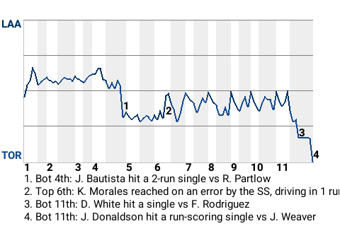 The Blue Jays got a clutch hit from third baseman Josh Donaldson. In the bottom of the 11th, he hit a run-scoring single to right, to win the game for the Blue Jays.