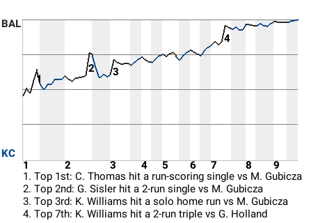 The Baltimore Orioles stifled the Kansas City Royals, 6-2, at Kauffman Stadium. Ken Williams, who is tied for 4th in the AL in triples with 3, had his hitting cap on. He went 3 for 4 with a home run, a triple, and a walk, while adding 3 RBI and scoring once for Baltimore. Baltimore is now 18-19. Kansas City is 15-19.