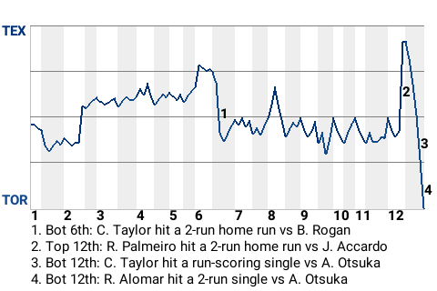 The game was decided with no one out in the bottom of the 12th. With Toronto trailing 5-4, Alomar hit a fastball from Akinori Otsuka for a 2-run single. In the blink of an eye, the Blue Jays had a walk-off win.