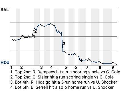 Gerrit Cole, who is tied for 2nd in the AL in innings pitched with 81.0, had a strong outing for the Houston Astros against the Baltimore Orioles at Minute Maid Park. The right-hander was a big part of his team's 5-2 win. Picking up the save was Larry Andersen, his 16th. Houston, at 36-17, is cruising.