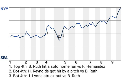 Both offenses were feeble at Safeco Field. Fortunately for the New York Yankees, though, Babe Ruth delivered in the clutch. He threw 6.1 innings of shutout ball, to help his team topple the Seattle Mariners, 1-0. The winner was Ruth. He threw 6.1 innings of shutout ball. The loser was Felix Hernandez. Getting the save was Mariano Rivera, his 18th.