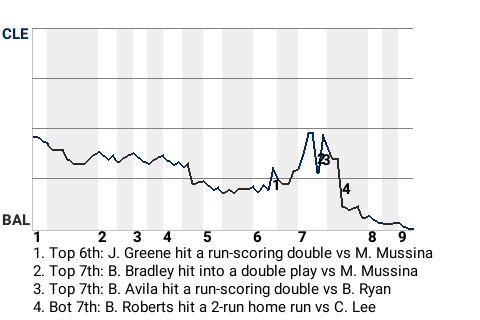 Baltimore took a 4-2 lead on Brian Roberts's 4th home run of the season. The 2-run home run, which Roberts hit in the bottom of the seventh, left Cleveland pitcher Cliff P Lee visibly frustrated.