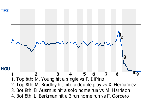 Houston went up, 2-1, on Brad Ausmus's 4th home run of the season. The solo home run, which Ausmus hit in the bottom of the eighth, left Texas pitcher Matt Harrison shaking his head.