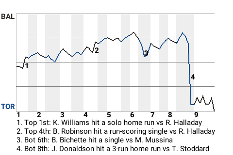 Toronto went up, 4-2, on Josh Donaldson's 12th home run of the season. The 3-run home run, which Donaldson hit in the bottom of the eighth, left Baltimore pitcher Tim Stoddard stewing.