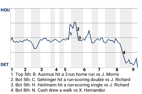 Houston catcher Brad Ausmus was sensational. He was 3 for 3 with a home run and 2 singles. He drove in 2 runs and scored once. But it wasn't enough to rally his team to a win. Detroit beat the Astros, 4-2. Willie Hernandez closed it out for his 12th save. Detroit is 4th in the American League Central Division with a record of 31-37.