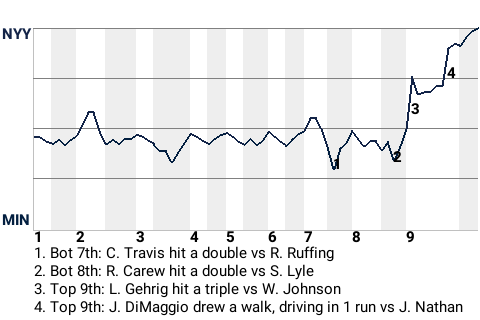 It could have been a different outcome for New York, had it not been for Joe DiMaggio, the 22-year old left fielder . DiMaggio contributed a run-scoring walk in the top of the ninth inning to put New York up, 1-0.