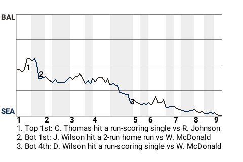 The Mariners got a big at-bat from designated hitter Jud Wilson. For the game, Wilson went 1-4 with a home run. He drove in 2 runs and scored once. In the bottom of the first, with a runner on 2nd, he stroked a 2-run home run. His 11th home run of the season gave Seattle a 2-1 lead.