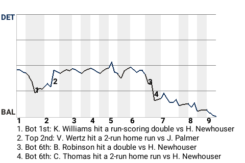 The Orioles got a big hit from left fielder Clint Thomas. Facing Detroit pitcher Hal Newhouser in the bottom of the sixth, Thomas pounded a 2-run home run to right. His 12th home run of the season put the Orioles ahead, 4-2.