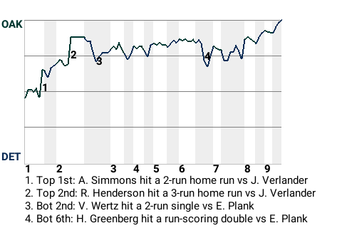 With Oakland leading 2-0 in the top of the second, Henderson came up to bat against Detroit pitcher Justin Verlander. Henderson hit a sinker to center for a 3-run home run. His 3rd home run of the season put the Athletics on top, 5-0.