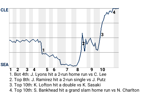 The Cleveland Indians topped the Seattle Mariners, 10-4, in 10 innings. Cleveland shortstop Sam Bankhead, in particular, was impressive. He went 1 for 1 with a home run, while adding 4 RBI and scoring once. Cleveland reliever Addie Joss picked up the win, upping his record to 4-4. Kazuhiro Sasaki absorbed the loss. The setback makes Seattle 38-42.