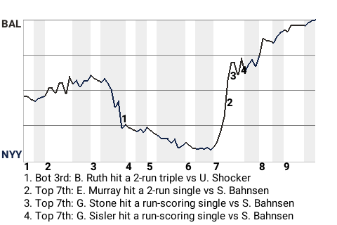 Baltimore took control in the top of the seventh. With one out and runners on 1st and 3rd, George Sisler hit a run-scoring single to make it 5-4, Orioles.