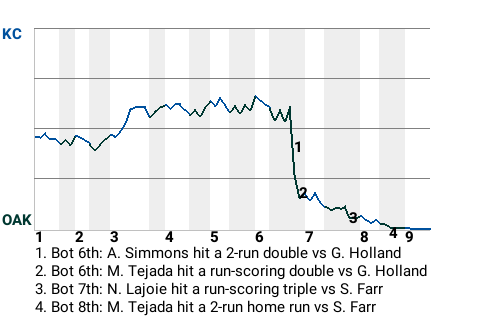 Al Simmons hit a 2-run double off Greg Holland in the bottom of the sixth, which put the Athletics in front, 2-1. In addition to the double, Simmons had 1 single, while going 2 for 4.