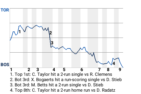An inflection point occurred with two out in the bottom of the third. That's when Red Sox center fielder Mookie Betts hit a slider from Dave Stieb for a 2-run single. Just like that, Boston was up, 3-2.
