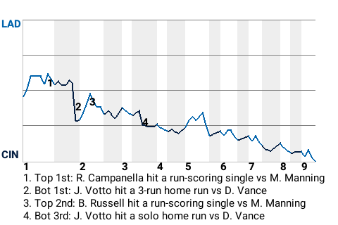 Votto had a consequential at-bat in the bottom of the first for the Reds. Coming up with runners on 1st and 2nd and Cincinnati trailing 1-0, he hit a 3-run home run.