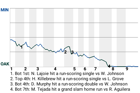 Miguel Tejada contributed to the Oakland win with a grand slam home run in the bottom of the seventh. For the game, the shortstop had 2 hits in 4 at-bats with 1 home run, 1 single, 1 run scored, and 4 RBI.