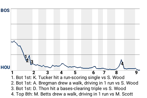 Dickie Thon had a big bases-clearing triple for the Astros in the bottom of the first inning. With Houston leading 2-0 and the bases loaded, he got a fastball from Smoky Joe Wood and swatted a triple to right-center. It was his 2nd triple of the season, and more importantly, it put the Astros ahead, 5-0.