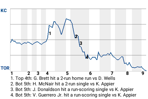 The Blue Jays took the lead, 5-3, in the bottom of the fifth inning. Facing Kansas City hurler Kevin Appier with two outs, Alexis Rios hit a run-scoring single.
