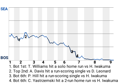The Red Sox got a big hit from left fielder Carl Yastrzemski. Facing Seattle pitcher Hisashi Iwakuma in the bottom of the sixth, Yastrzemski pounded a 2-run home run to left. His 11th home run of the season put the Red Sox ahead, 5-1.