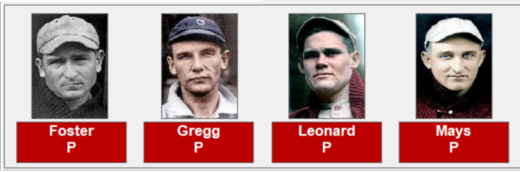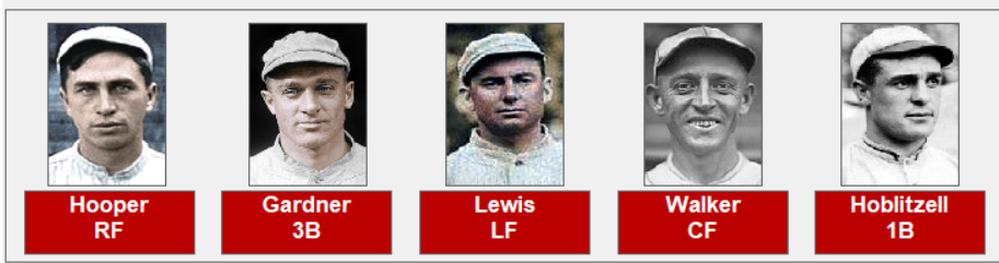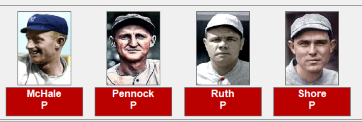 Below is the roster for the Boston Red Sox. Pitchers; Rube Foster, Vean Gregg, Dutch Leonard, Carl Mays, Marty McHale, Herb Pennock, Babe Ruth and Ernie Shore. Batters; Harry Hooper, Larry Gardner, Duffy Lewis, Tillie Walker, Dick Hoblitz, Everett Scott, Jack Barry, and Pinch Thomas.