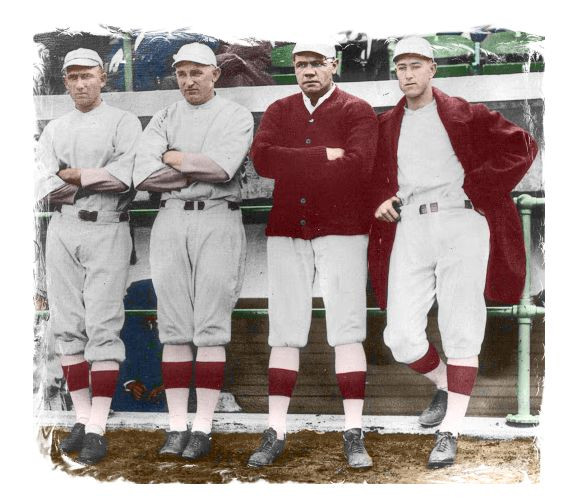 Pictured on the right is the Red Sox pitching staff, Sam Jones, Carl Mays, Babe Ruth and Joe Bush. Babe Ruth and Sam Jones pitched shutouts against the American Giants in their series. Babe also belted a home run in the final game off Dick Whitworth at Fenway Park.