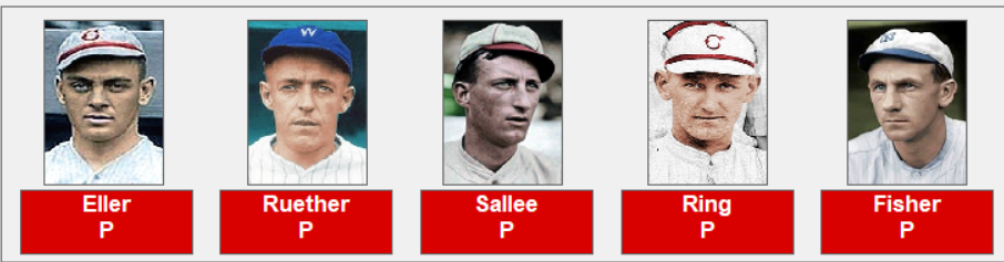 Reds pitching staff; Hod Eller, Dutch Ruether, Slim Sallee, Jimmy Ring, Dolf Luque, Rube Bressler, Roy Mitchell, and Ed Gerner.
