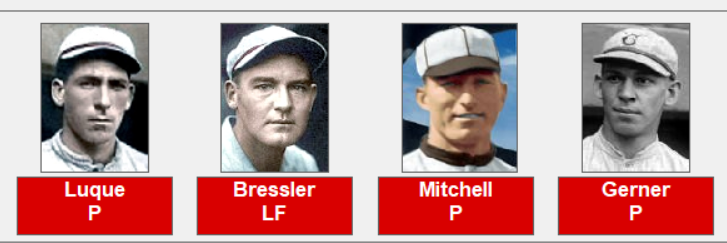 The Reds were led by Heinie Groh, Edd Roush, Greasy Neale and Ivey Wingo at the plate. From the mound Hod Eller won two contests, Dutch Ruether and Slim Sallee the other games. For the Stars Bruce Petway, Vicente RodrIguez, and John Donaldson, who belted 3 homers in the series provided the bats. John Donaldson also pitched in game three but lost to Slim Sallee of the Reds.
