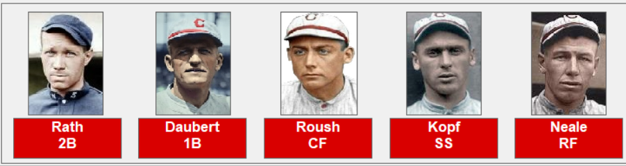 Cincinnati Reds batters; Morrie Rath, Jake Daubert, Edd Roush, Larry Kopf, Greasy Neale, Heinie Groh, Ivy Wingo, Bill Rariden, and Rube Bressler.