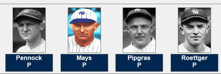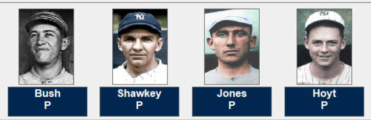 Here are the champion Yankees; pitchers Joe Bush, Bob Shawkey, Sad Sam Jones, Waite Hoyt, Herb Pennock, Carl Mays, George Pipgras and Oscar Roettger.
