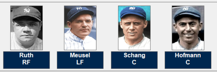 The starting lineup; Joe Dugan, Whitey Witt, Wally Pipp, Aaron Ward, Everett Scott, Babe Ruth, Bob Meusel, Wally Schang snd Fred Hoffman.