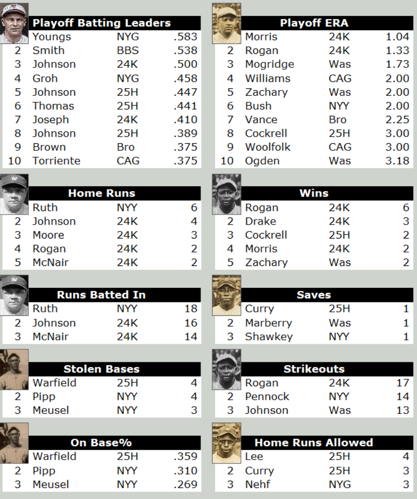 In 1924 the NNL held it’s first champion series in which the KC Monarchs defeated the Hilldale Club. In the MLB the Washington Nationals beat the New York Giants in the world series. In our 10th Integrateted playoffs those four clubs will be joined by the Chicago American Giants and the Baltimore Black Sox in the NNL. The Brooklyn Robins and the New York Yankees will be added to the playoffs representing the MLB.