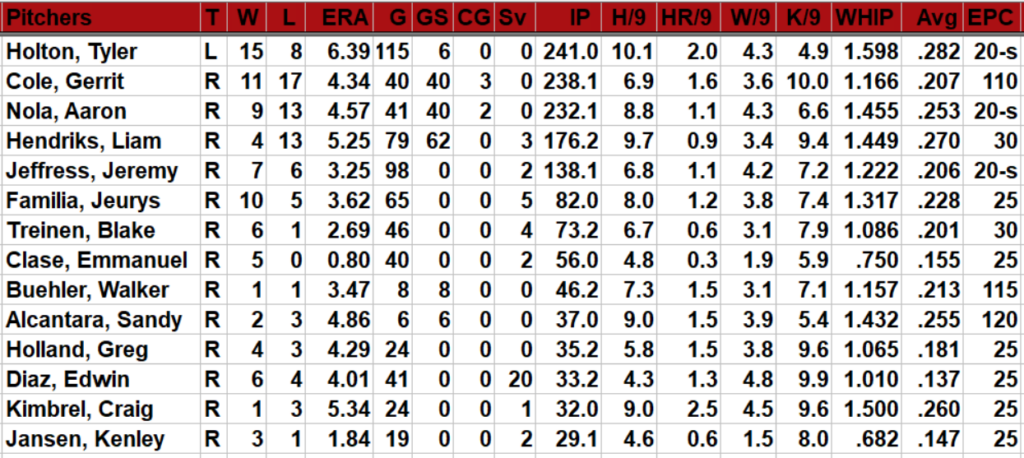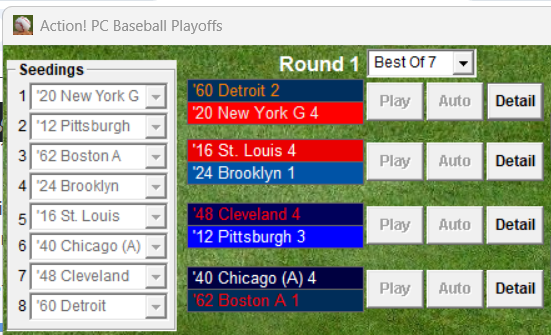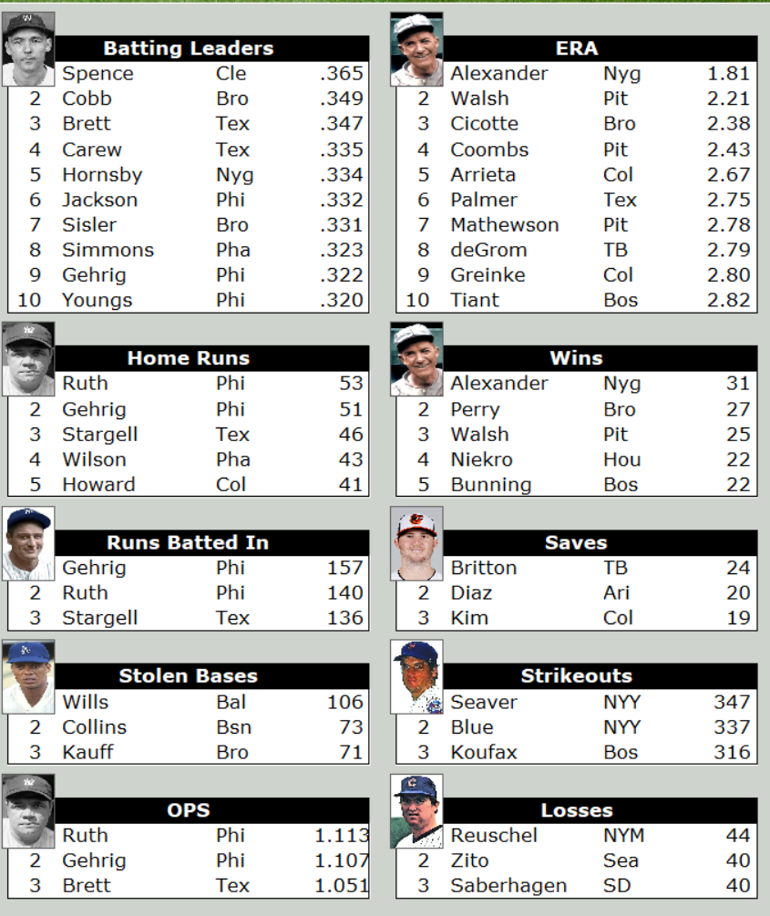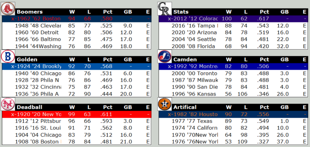After simulating a 162 game season with the 30 clubs the following clubs finished 1-8 in each league. In the 1900-1968 league, including the Deadball, Golden and Boomers eras were ranked top to bottom; 1920, 1912, 1962, 1924, 1916, 1940, 1948, and 1960. In the 1969-2024 league icluding the Artifical Turf, Canden Yards and the Statistical eras. the clubs were ranked top to bottom; 2012, 1982, 1977, 2016, 2020, 1992, 1974, and 2000. Remember the teams are made up of the top WAR players from a span of 4 years, i. the 1992 clubs includes players from 1989-1992.