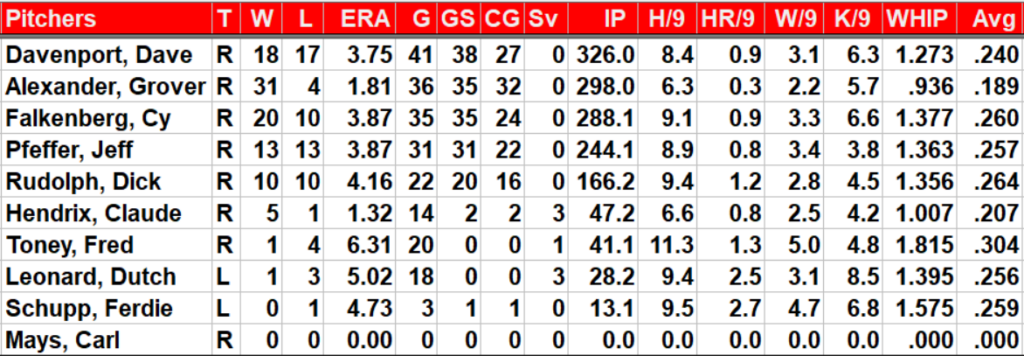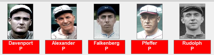 The Champion 1920 New York Giants club. Starting pitchers; Dave Davenport, Grover Cleveland Alexander, Cy Falkenberg, Jeff Pfeffer, and Dick Rudolph.